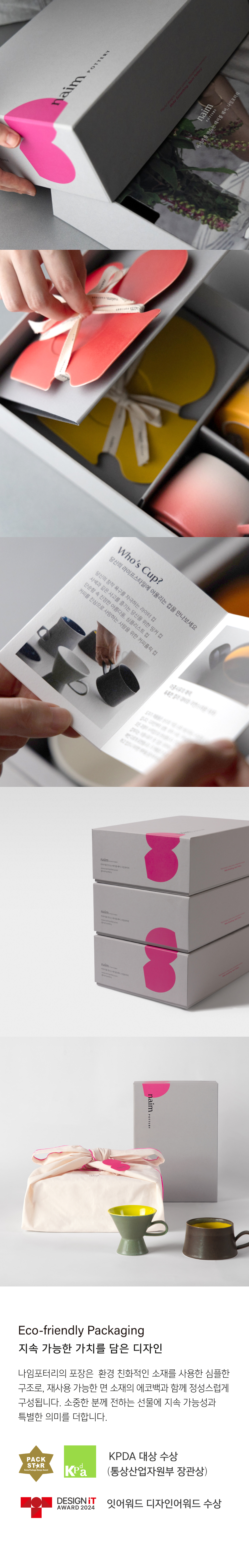 나임포터리 세트는 환경을 생각한 심플한 구조의 패키지와 형광과 표백 처리를 거치지 않은 면직물 에코백(보자기형)으로 구성되어 있습니다. 소중한 분께 전하는 선물에 특별한 의미를 더합니다. |