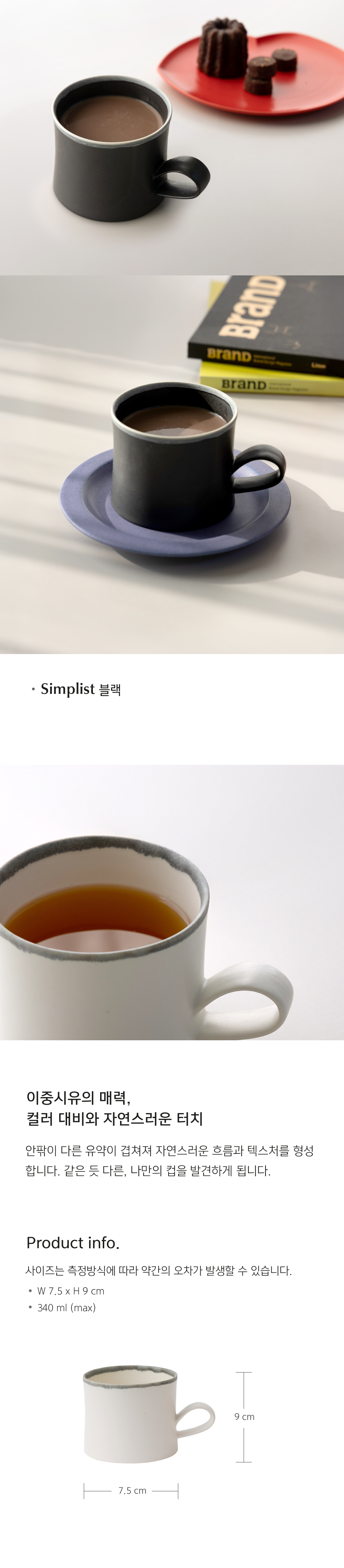 단순함 속 진정한 아름다움 심플리스트(Simplist)는 화이트과 그레이의 은은한 색조, 입술이 닿는 부분에 번지는 먹색 유약의 자연스러운 농담으로 완성됩니다. 직선인 듯 곡선인 독특한 라인과 절제된 디자인으로 공예적 정서를 담아낸, 단순한 아름다움을 추구하는 이를 위한 오브제입니다. |