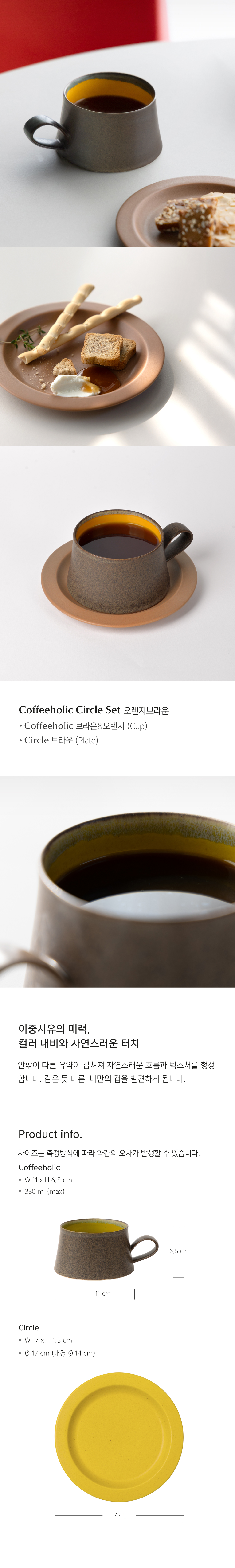 커피홀릭과 써클의 조합 커피홀릭 컵의 열대의 자연을 닮은 색감과 낮고 넓은 형태는 커피의 맛과 향을 더욱 풍부하게 담아냅니다. 커피홀릭 컵과 원형 플레이트는 각각으로도 충분히 쓰임과 매력을 지니지만, 함께 어우러질 때 일상의 공간은 더욱 감각적으로 완성됩니다. 컵에 받침이 더해지면 테이블은 한층 더 단정해집니다. |