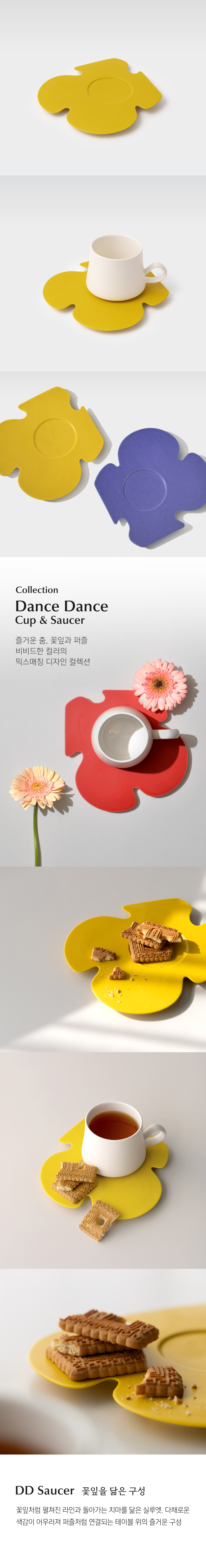 움직임을 담은 형태 댄스댄스 소서는 즐거운 춤, 돌아가는 치마, 퍼즐, 꽃잎을 닮은 유려한 라인으로 디자인되었습니다. 선명한 컬러가 공간에 확실한 악센트를 더하며, 여러 개를 조합할수록 더욱 독창적인 형태가 펼쳐집니다. 컵과 어우러질 때, 색의 조합이 더해질수록 즐거움은 깊어집니다. |